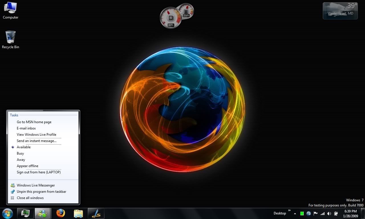 That is my Windows 7 desktop on my laptop. Click on it for the full size image, the same goes for all pics that’ll end up in here. One noticeable change is the taskbar, which Microsoft has been calling the “Superbar.” All of the taskbar items are icons and you can move the icons about into whatever order you please unlike past Windows versions. Multiple windows of a program get lumped together into the one icon. If you still like the thinner taskbar with items like in the past you can change that in the Taskbar properties. One neat thing is that you can pin items to the taskbar like you could to the start menu, that way just click on the icon on the taskbar and go.