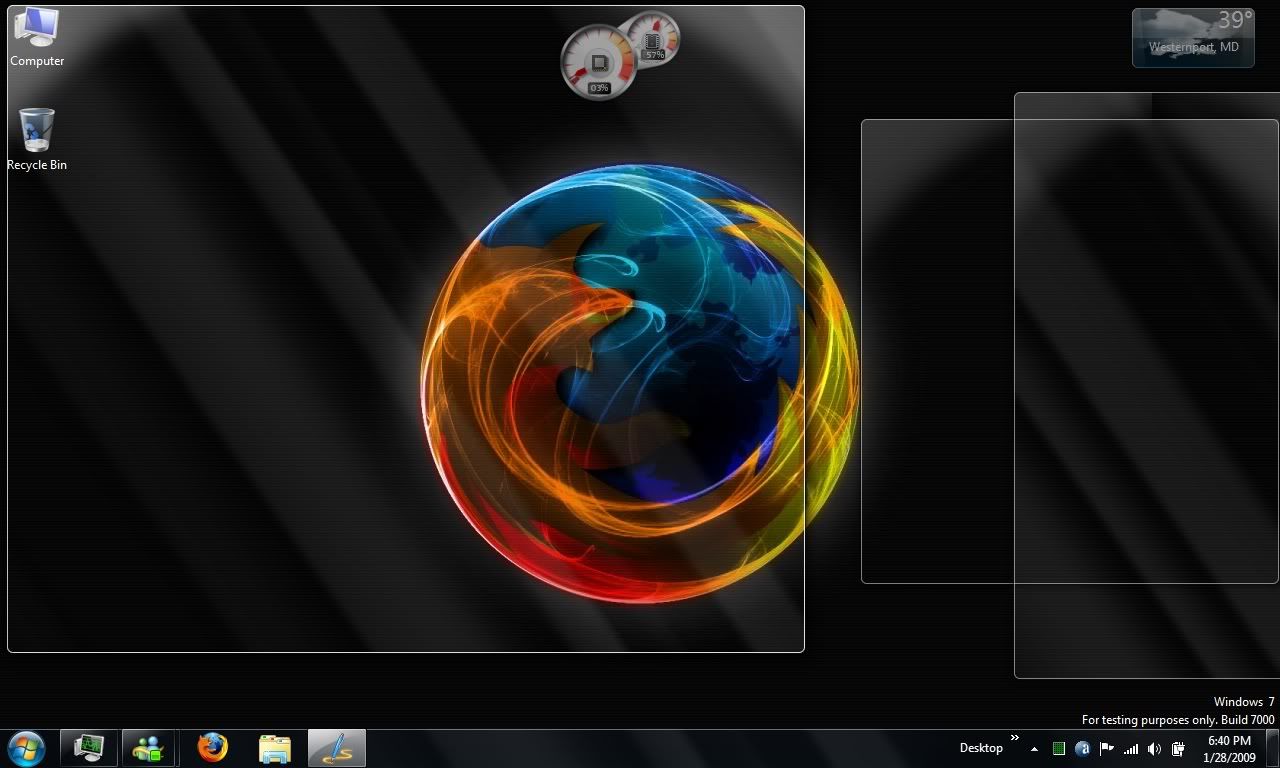 One more new taskbar feature is over on the very right. That is the show desktop button, clicking that minimizes windows and shows the desktop, obviously. Click it again restore everything that wasn’t minimized before the button was clicked the first time. For those with Aero enable, the button does another trick. Simply hovering over the button shows the desktop but with the outlines of open windows. That little feature is being called Aero Peek.